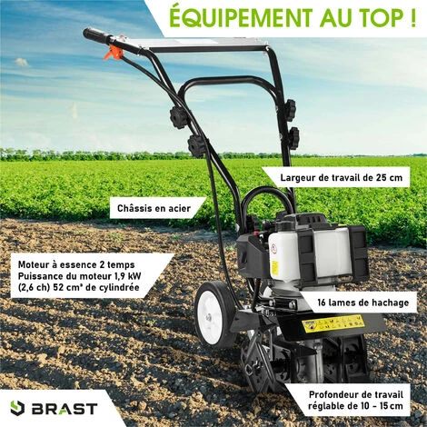 - Grâce à sa profondeur de travail réglable de 100 à 115 mm et à sa largeur de travail de 250 mm, notre motobineuse BRAST est supérieure à de nombreuses petites houes en termes de vitesse et d’efficacité.